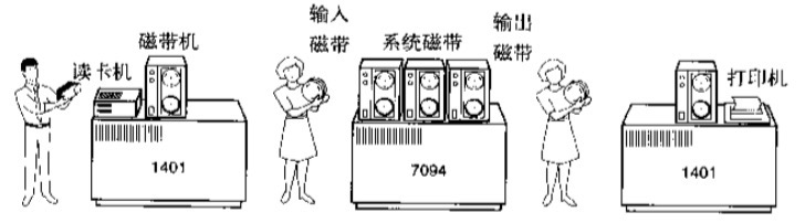 共三台计算机,二台1401侧重于IO,一台7094侧重于运算; 一堆卡片 通过1401读入磁带机,经过系统磁带处理后, 输入磁带给7094,7094批处理运算后输出磁带给另一台1401进行打印..