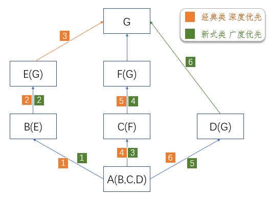 [<class '__main__.A'>, <class '__main__.B'>, <class '__main__.E'>, <class '__main__.C'>, <class '__main__.F'>, <class '__main__.D'>, <class '__main__.G'>, <class 'object'>]