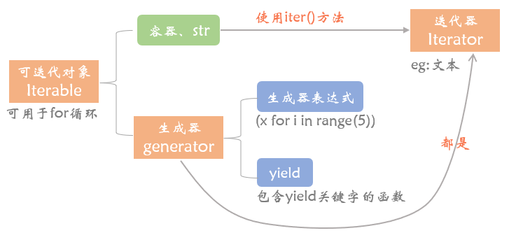 可迭代对象 iterable: 内置有__iter__方法的对象 eg: 常见的容器(列表 元祖 字典 集合) 、字符串、文件