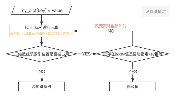 先判断key值是否一样,'yy' != 'xx' Python底层会改变策略重新映射,直到映射出来的索引没有被占用..
