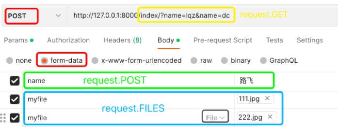 2> formdata -- 普通数据部分 request.POST; 文件部分 request.FILES