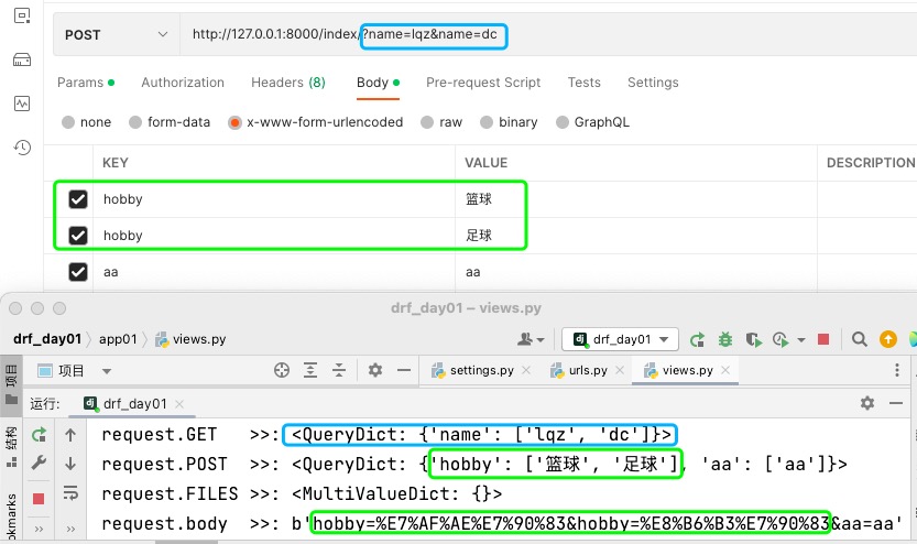 http://127.0.0.1:8000/index/?name=lqz&name=dc,后端结果如下: