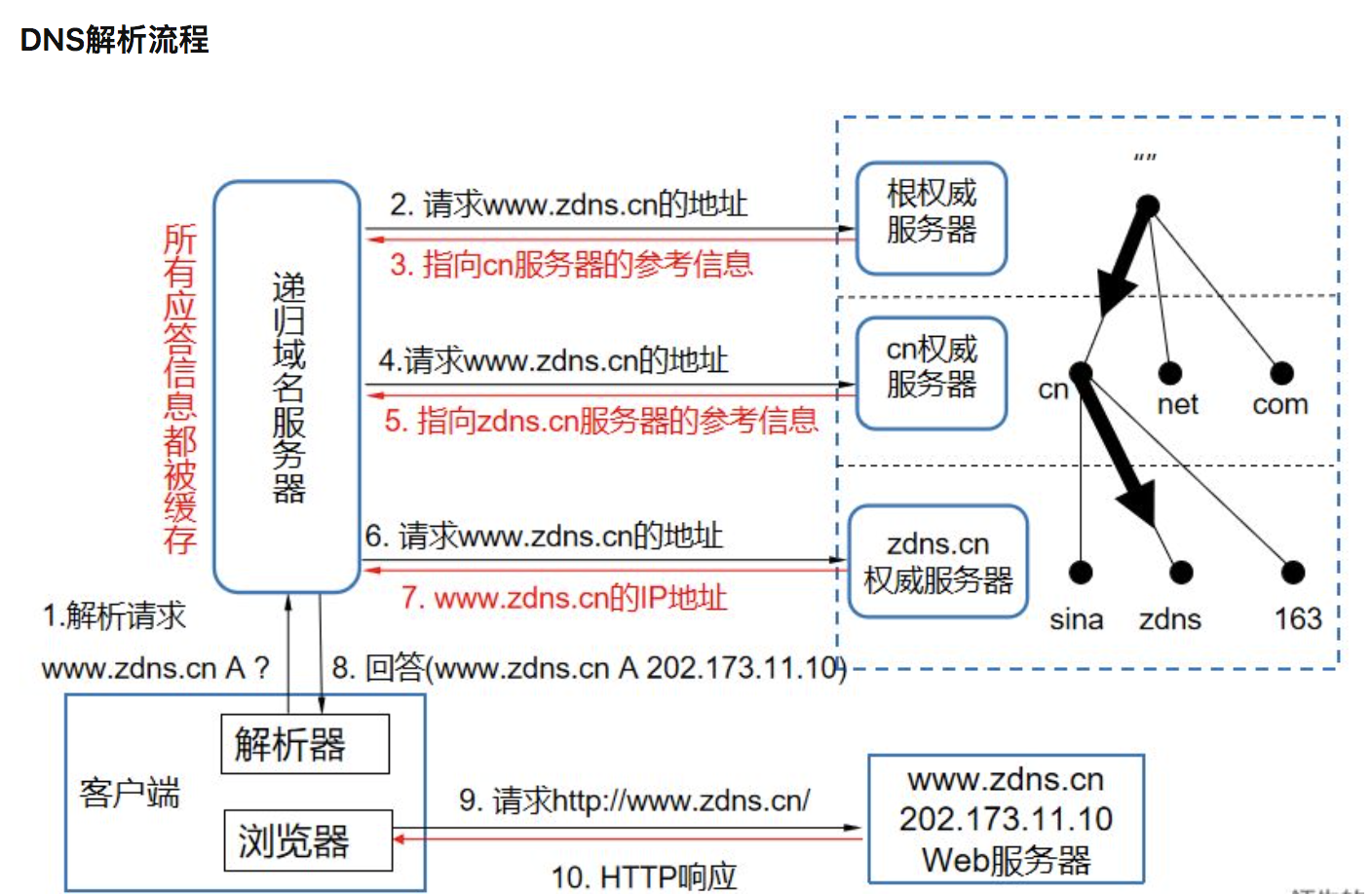Ps: 一旦递归服务器拿到解析记录以后, 就会在本地进行缓存 , 如果下次客户端再请求本地的递归域名服务器相同域名的时候, 就不会再这样一层一层查了, 因为本地服务器里面已经有缓存了(达到了加速的效果)!要知道缓存是有TTL的生命周期的,需要定时更新.