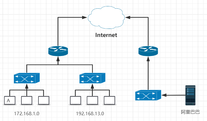 假设有两间大教室,教室1处于网段172.168.1.0,教室2处于网段192.169.13.0; 教室1中的主机A要访问阿里巴巴的服务器...访问的是阿里巴巴服务器的公网IP,再映射成私有IP.