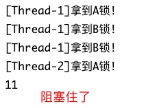 在线程1释放掉A锁后,[Thread-2]抢到了A锁,继续执行,发现B锁还处于被占用的状态.