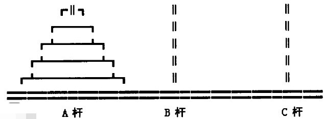 有三根杆(编号A、B、C), 在A杆自下而上、由大到小按顺序放置64个金盘.
