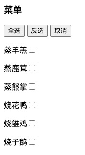 效果: 点击全选,全部勾选上;点击取消,全部取消勾选;点击反选,勾选上的取消,未勾选的勾选上..