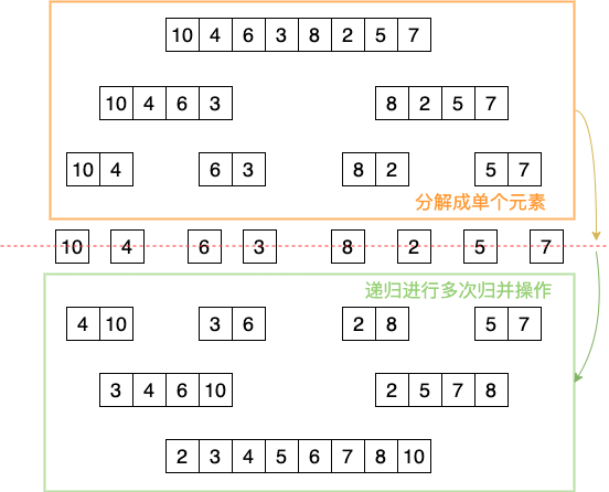 # 列表中只有一个元素时候,列表肯定是有序的. 意味着分解完成. 开始合并!!