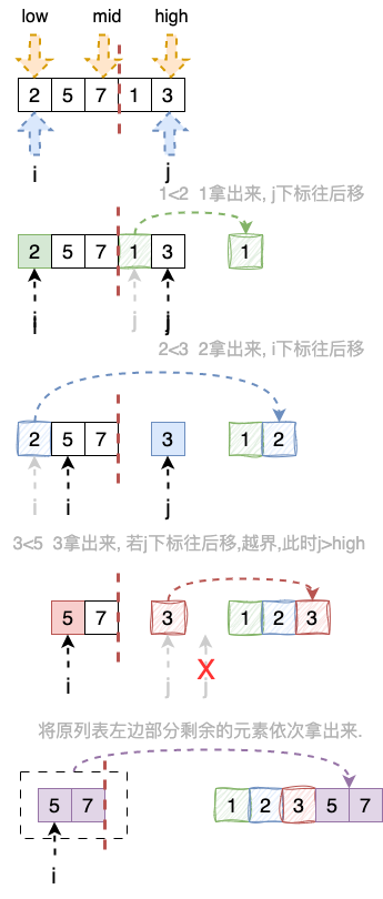 假设现在的列表分两段有序, 如何将其合成为一个有序列表? -- 这种操作称为一次归并!!