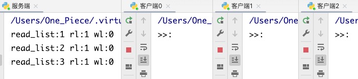 最后,服务端阻塞在select.select()处,此时,read_list = [server,conn0,conn1,conn2],rl = [] (这是伪代码)