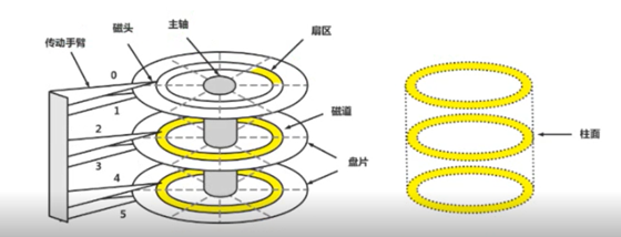 2> 柱面 : 图中的6个磁头在自个儿所处的盘面的同一磁道从上到下构成了一个柱面.