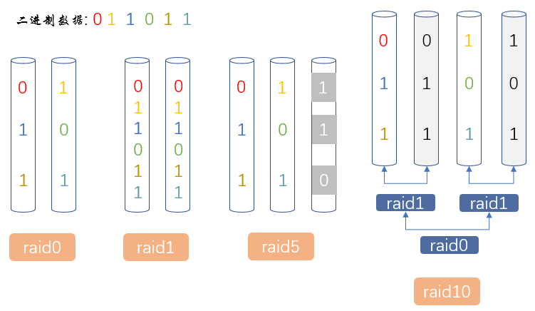 | RAID1 | 2块(只能) | 100%冗余,镜像 | 读写性能一般,成本较高 | 单独的,数据很重要且不能宕机的业务监控,系统盘 |