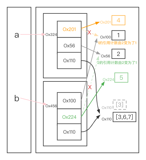 >>> a[0] = 4 # -- 修改a列表中的不可变对象(重新赋值),b列表不会受到影响
