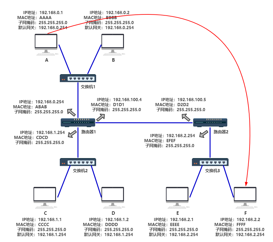 数据包的格式: MAC(主机A) MAC(默认网关) IP(A) IP(F) 数据部分