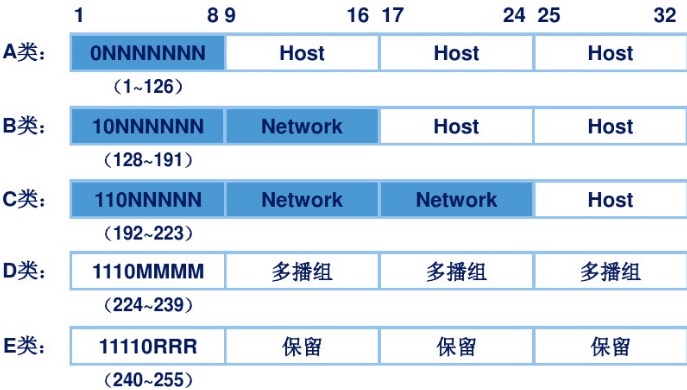 约定前1、2、3个8位组分别为A、B、C类IP地址的网络号!(也就约定了子网掩码) D类组播地址;E类研究地址.